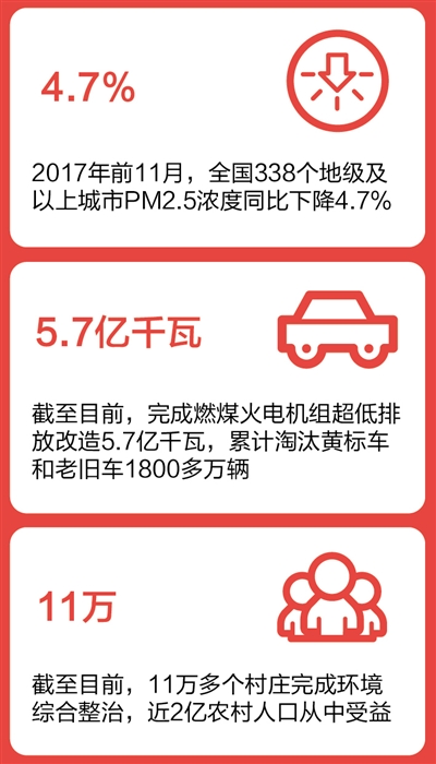 党的十八大以来,我国相继发布实施大气、水、土壤污染防治三大行动计划,环境基础设施建设加速推进,实施燃煤火电机组超低排放改造,目前为止已经完成5.7亿千瓦,累计淘汰黄标车和老旧车1800多万辆。同时,11万多个村庄完成环境综合整治,近2亿农村人口从中受益。重大生态保护和修复工程进展顺利。