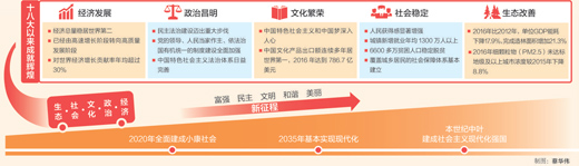 党的十八大以来,在新中国成立特别是改革开放以来我国发展取得重大成就的基础上,党和国家事业发生历史性变革,中国特色社会主义进入了新时代。基于对我国发展新的历史方位的科学判断,顺应人民对美好生活的向往,党的十九大将实现第二个百年奋斗目标分两个阶段来安排:第一个阶段,从2020年到2035年,在全面建成小康社会的基础上,再奋斗15年,基本实现社会主义现代化。这把我们党在上世纪80年代提出的21世纪中叶基本实现现代化的目标提前到2035年完成。第二个阶段,从2035年到本世纪中叶,在基本实现现代化的基础上,再奋斗15年,把我国建成富强民主文明和谐美丽的社会主义现代化强国。从全面建成小康社会到基本实现现代化,再到全面建成社会主义现代化强国,是新时代中国特色社会主义发展的战略安排。