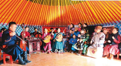 2017年11月23日,苏尼特右旗乌兰牧骑队员在桑宝拉格苏木额尔登塔拉嘎查为牧民表演文艺节目。乌兰牧骑,蒙古语意为“红色的嫩芽”,后被引申为“红色文艺轻骑兵”,是适应草原上地广人稀特点而诞生的文化工作队。