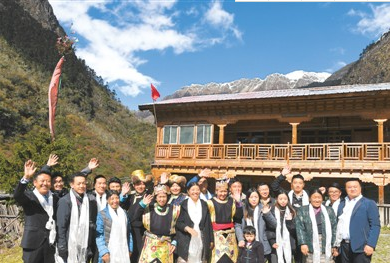 2017年10月29日,卓嘎、央宗姐妹和玉麦乡干部群众合影。隶属西藏山南市隆子县的玉麦乡位于中印边境,是中国人口最少的行政乡,全乡9户32人,农牧民党员9名。