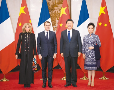 1月8日,国家主席习近平在北京钓鱼台国宾馆会见来华进行国事访问的法国总统马克龙。这是习近平和夫人彭丽媛同马克龙夫妇合影。新华社记者 李学仁摄