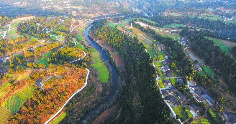 1月14日记者在阆中市枣碧乡杨家河村上空俯拍的杨家河沿线风光。近年来,当地大力发展乡村旅游和香桃种植产业,在杨家河村陆续投放10艘竹筏,设立专门农产品交易区,打造稻田捉鱼、农田拉水、皮划艇漂流等旅游体验项目。目前该村新开办农家乐8家,旺季日均接待游客达到1500人次。本报记者李向雨摄