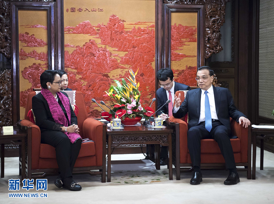 2月9日,国务院总理李克强在北京中南海紫光阁会见来华正式访问的印度尼西亚外长蕾特诺。 新华社记者 李涛 摄