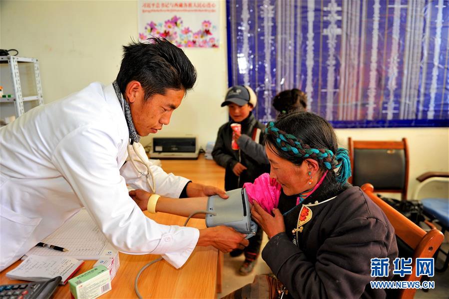 普玛江塘乡卫生院全科医生旺扎为农牧民查体(2018年1月14日摄)。2014年,旺扎从西藏藏医学院毕业,来到条件艰苦的乡卫生院工作,承担全乡282户近1100人的卫生保健任务。新华社记者 张汝锋 摄