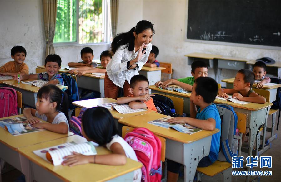 特岗乡村英语教师黄妮娜(中)在海南省保亭黎族苗族自治县保城镇西坡小学上课(2017年9月4日摄)。她分管三个小学,每周要上27节课。新华社记者 郭程 摄