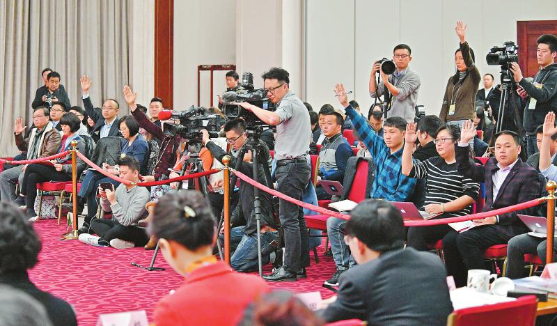 3月8日,十三届全国人大一次会议四川代表团全体会议向媒体开放,现场各媒体记者争相举手提问。本报记者毛漫丁摄