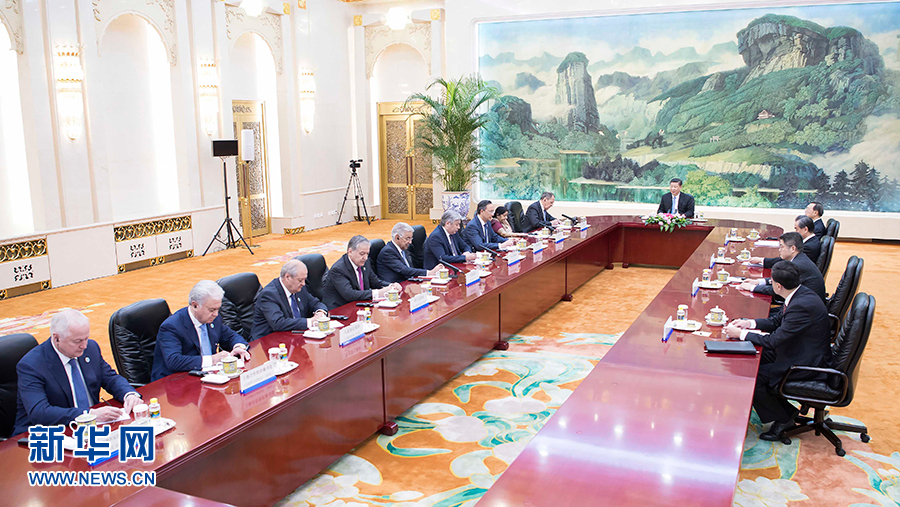 4月23日,国家主席习近平在北京人民大会堂集体会见来华出席上海合作组织成员国外长理事会会议的俄罗斯外长拉夫罗夫、印度外长斯瓦拉杰、哈萨克斯坦外长阿布德拉赫曼诺夫、吉尔吉斯斯坦外长阿布德尔达耶夫、巴基斯坦外长阿西夫、塔吉克斯坦外长阿斯洛夫、乌兹别克斯坦外长卡米洛夫、上海合作组织秘书长阿利莫夫、上海合作组织地区反恐怖机构执委会主任瑟索耶夫。新华社记者 李涛 摄