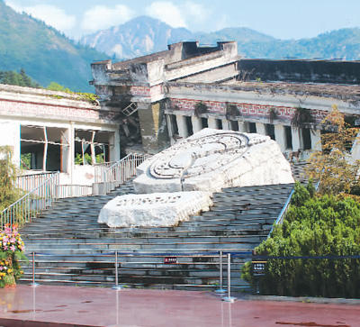 倒塌的主楼定格在“5·12”那个下午的姿势,部分遇难者仍然长眠在扭曲的钢筋水泥下。汉白玉纪念碑上摆满了黄色或白色的菊花。后建的七一中学、八一中学漂亮而挺拔。