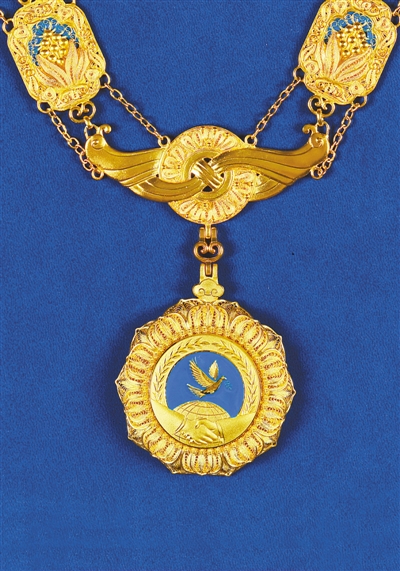 根据《中华人民共和国国家勋章和国家荣誉称号法》,国家设立中华人民共和国“友谊勋章”。中华人民共和国“友谊勋章”章体以金色、蓝色为主色调,采用和平鸽、地球、握手、荷花等元素,章链采用中国结、万年青、牡丹花、玉璧、兰草等元素,整体采用花丝镶嵌、掐丝珐琅等传统工艺手工制作。图为中华人民共和国“友谊勋章”。