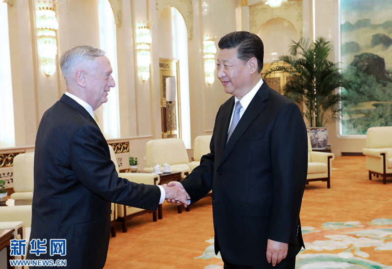 6月27日,国家主席习近平在北京人民大会堂会见来访的美国国防部长马蒂斯。新华社记者李刚摄