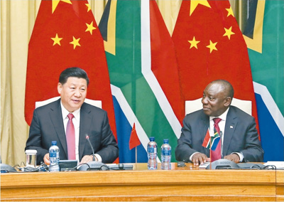 习近平强调,发展同非洲国家团结合作是中方长期、坚定的战略选择。再过一个多月,我和拉马福萨总统将共同主持召开中非合作论坛北京峰会。南非作为现任论坛非方共同主席国,为论坛机制建设和中非友好合作作出重要贡献。中方期待届时同论坛非方成员一道,共商新时期中非友好合作发展大计,携手打造更加紧密的中非命运共同体。