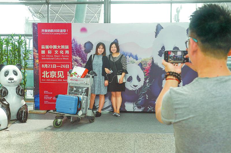 首届中国大熊猫国际文化周即将在北京举行,八月十六日成都双流国际机场布置的大熊猫图案墙,引来旅客合影留念。本报记者郝飞摄