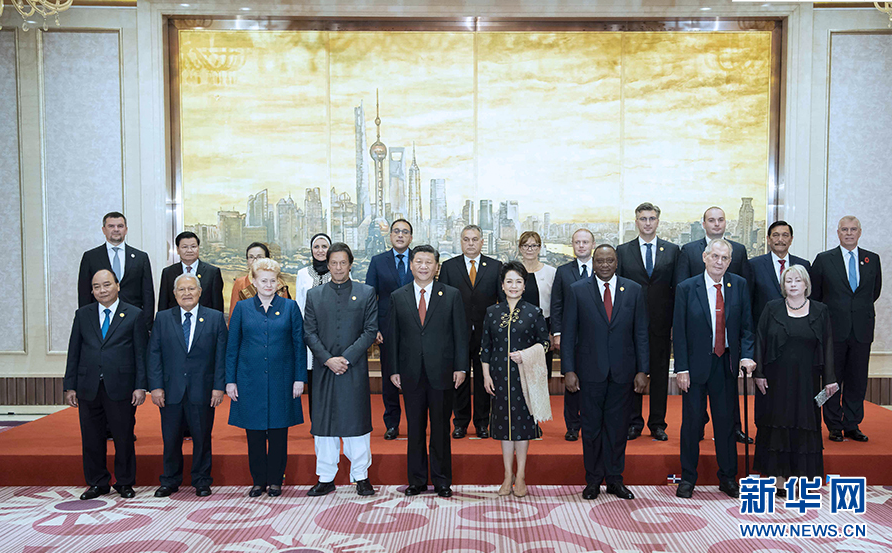 11月4日晚,国家主席习近平和夫人彭丽媛在上海举行宴会,欢迎出席首届中国国际进口博览会的各国贵宾。这是宴会前,习近平和彭丽媛同各国领导人夫妇合影留念。 新华社记者 李涛 摄