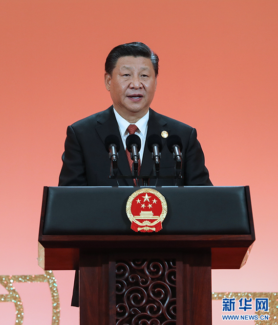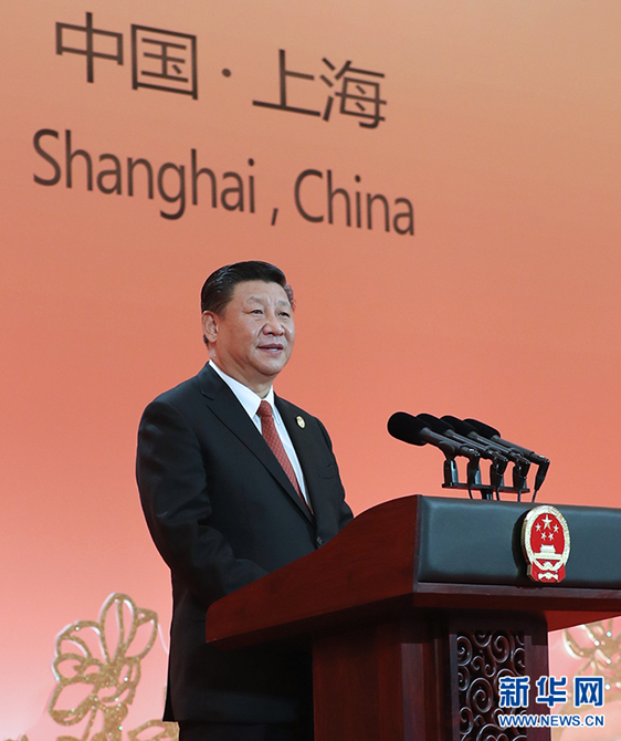 11月4日晚,国家主席习近平和夫人彭丽媛在上海举行宴会,欢迎出席首届中国国际进口博览会的各国贵宾。这是习近平发表致辞。 新华社记者 谢环驰 摄