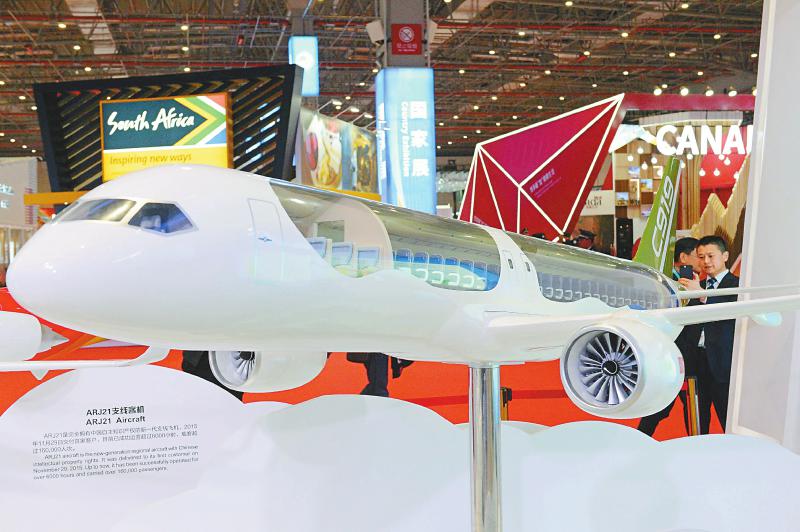 进口博览会上展出的ARJ21支线客机模型。本版摄影 本报记者 李向雨