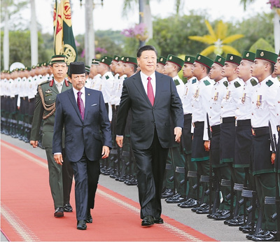 习近平抵达王宫时,哈桑纳尔在停车处热情迎接。两国元首登上检阅台。仪仗队行礼,军乐队奏中文两国国歌。现场鸣放21响礼炮。在哈桑纳尔陪同下,习近平检阅仪仗队。检阅毕,两国元首前往王宫内廷。习近平同文莱王室成员、主要官员及各国驻文莱使节握手。哈桑纳尔同中方陪同人员握手。