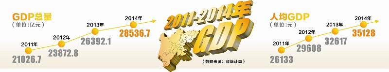 “十二五”期间,四川经济总量不断扩大。2011年,四川跻身全国“两万亿俱乐部”,地区生产总值(GDP)达21026.7亿元,2014年GDP总量28536.7亿元,“十二五”前4年的经济总量已经超过前10年(“十五”、“十一五”两个时期)之和。2015年,全省经济总量有望超过3万亿,用4年时间再上一个万亿台阶。2011-2014年,四川地区生产总值年均实际增长11.5%,增速比全国快3.5个百分点。