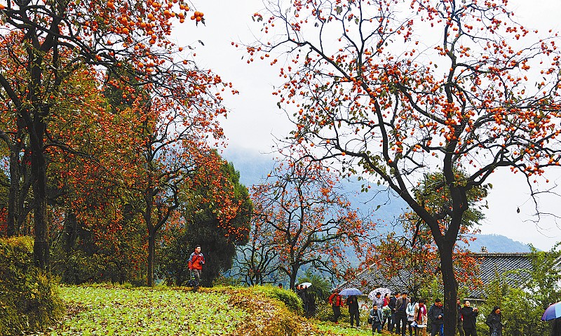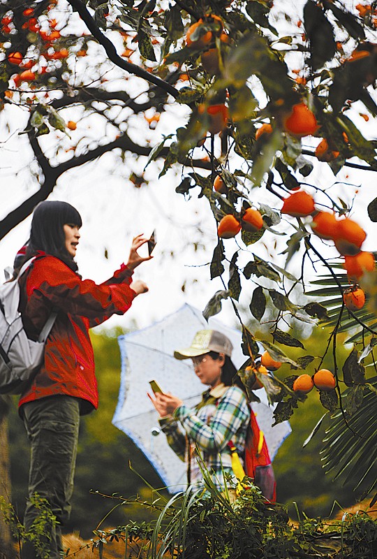 广元市昭化区大朝乡贫困村牛头村今年柿子大丰收,11月7日,该村举办首届柿子节,旨在提升牛头村知名度,增强客商投资旅游休闲康养产业发展信心,助力脱贫。图为柿子节当天,牛头村压弯树枝的柿子吸引了不少游客前往观赏、拍照。刘文龙/图 本报记者 程文雯/文