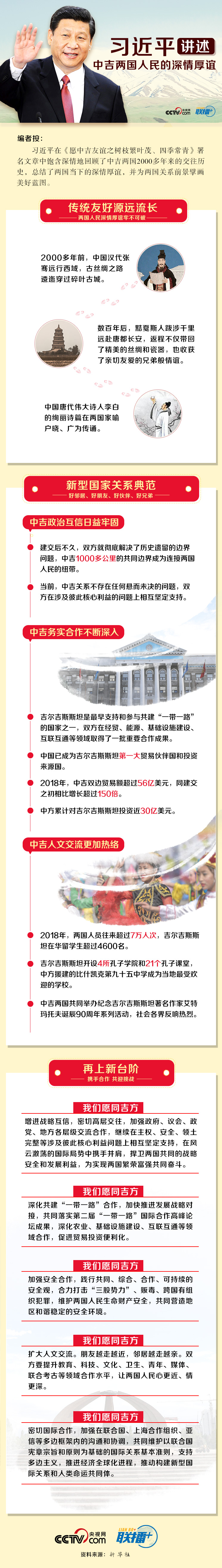 6月11日,在对吉尔吉斯共和国进行国事访问并出席上海合作组织成员国元首理事会第十九次会议前夕,习近平主席在吉尔吉斯斯坦媒体发表题为《愿中吉友谊之树枝繁叶茂、四季常青》的署名文章。