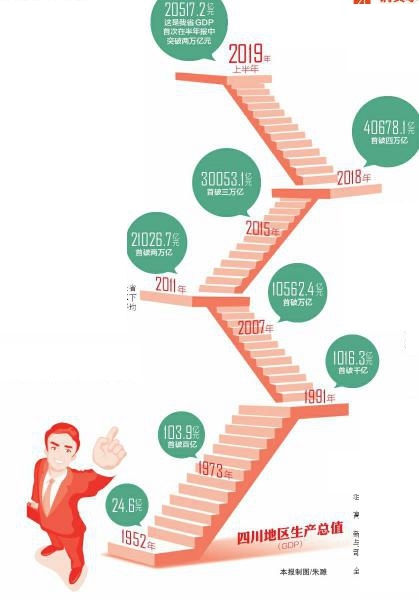 从几十亿元到几万亿元的历史性跨越——1952年,四川地区生产总值仅有24.6亿元;2018年突破4万亿,达到40678亿元,按不变价计算是1952年的182倍。