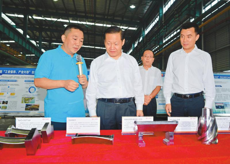九月四日,省委书记、省人大常委会主任彭清华到位于江油市的六合特种金属材料公司调研,观看产品和技术展示,详细了解企业生产经营、科技创新、市场拓展等情况。本报记者 欧阳杰 摄