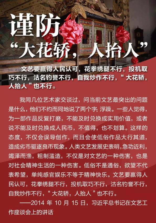 2014年10月15日,习近平主持召开文艺工作座谈会并发表重要讲话。谈及我国文艺繁荣发展的5个问题,强调实现中华民族伟大复兴需要中华文化繁荣兴盛,创作无愧于时代的优秀作品,坚持以人民为中心的创作导向,中国精神是社会主义文艺的灵魂,加强和改进党对文艺工作的领导 。
