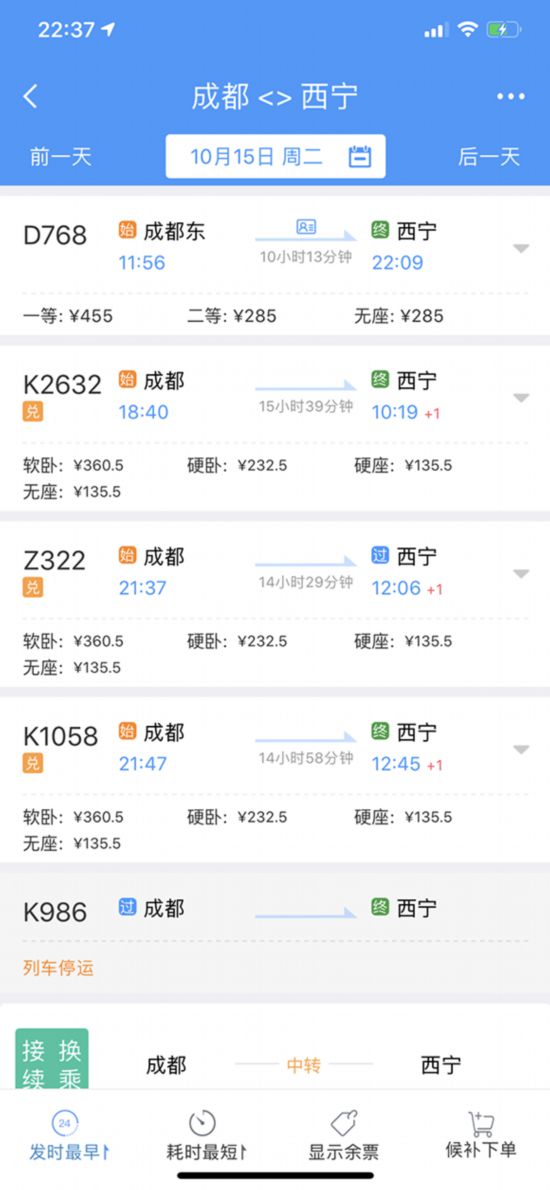 记者查询发现,成都到西宁10月15日,D768次动车从成都东到西宁,运行时间10小时13分钟,与目前成都、西宁间最快的“K”字头普速列车相比,动车运行时间减少了4多小时。发车时间为上午11:56分,到达时间为晚上22:09分。