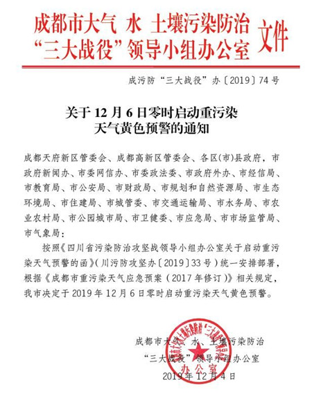 12月4日,成都市大气、水、土壤污染防治“三大战役”领导小组办公室发布消息,按照《四川省污染防治攻坚战领导小组办公室关于启动重污染天气预警的函》统一安排部署,根据《成都市重污染天气应急预案(2017年修订版)》,决定于2019年12月6日零时启动重污染天气黄色预警。