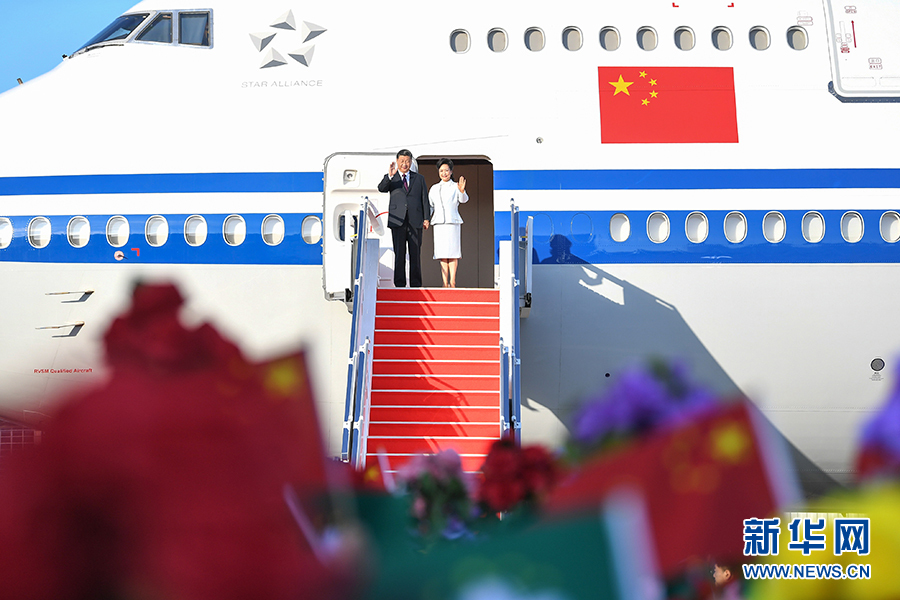 16时许,习近平乘坐的专机徐徐降落在澳门国际机场。习近平和夫人彭丽媛走出舱门,向欢迎人群挥手致意。澳门警察乐队奏响热情喜庆的欢迎曲,现场一片欢腾。舷梯旁,两名澳门少年儿童向习近平和彭丽媛献上鲜花。在澳门特别行政区行政长官崔世安和夫人霍慧芬陪同下,习近平和彭丽媛同前来迎接的人员亲切握手。数百名澳门青少年和各界群众代表挥动国旗、特别行政区区旗和鲜花,热烈欢迎习近平的到来。