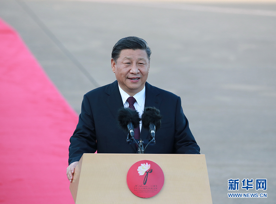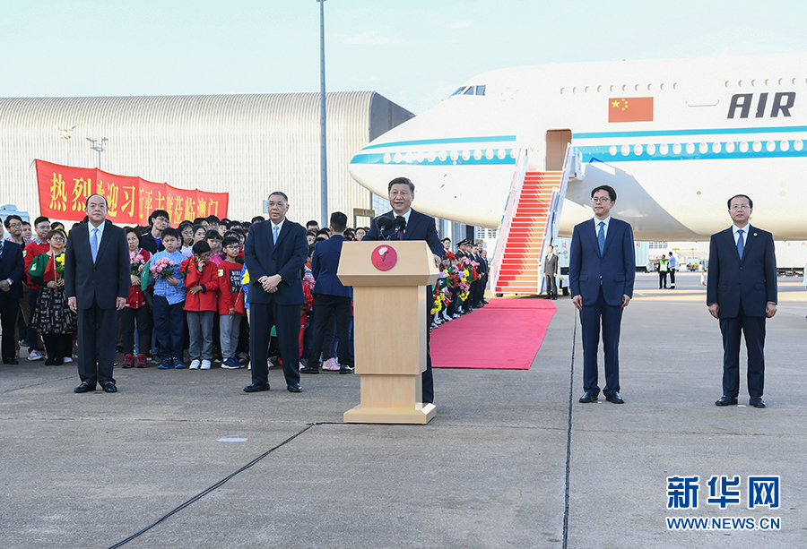 12月18日,中共中央总书记、国家主席、中央军委主席习近平乘专机抵达澳门,出席将于20日举行的庆祝澳门回归祖国20周年大会暨澳门特别行政区第五届政府就职典礼并视察澳门。这是习近平在机场发表重要讲话。 新华社记者 庞兴雷 摄
