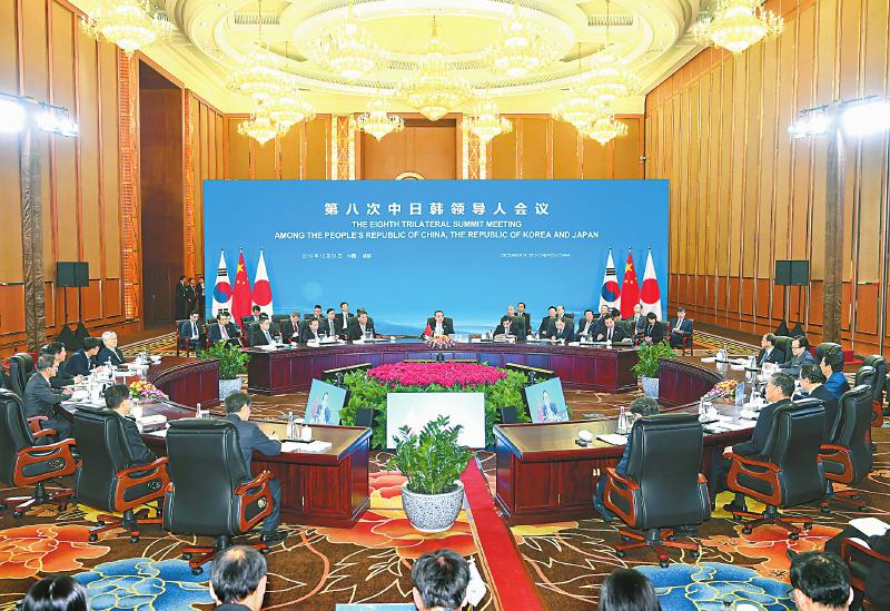十二月二十四日,国务院总理李克强在成都与韩国总统文在寅、日本首相安倍晋三共同出席第八次中日韩领导人会议。新华社记者张领摄