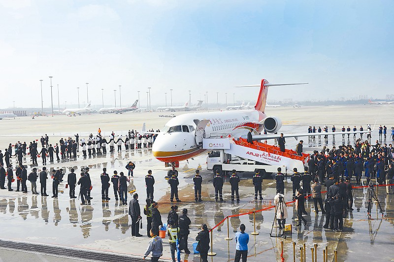 当日10时35分,首架ARJ21飞机从制造商中国商飞公司所在地——上海出发,飞行两个多小时,降落在全球首家运营客户成都航空公司所在地——成都,并完成交付。中国首款按照国际标准研制、具有自主知识产权的喷气式支线客机——ARJ21飞机正式进入市场运营。