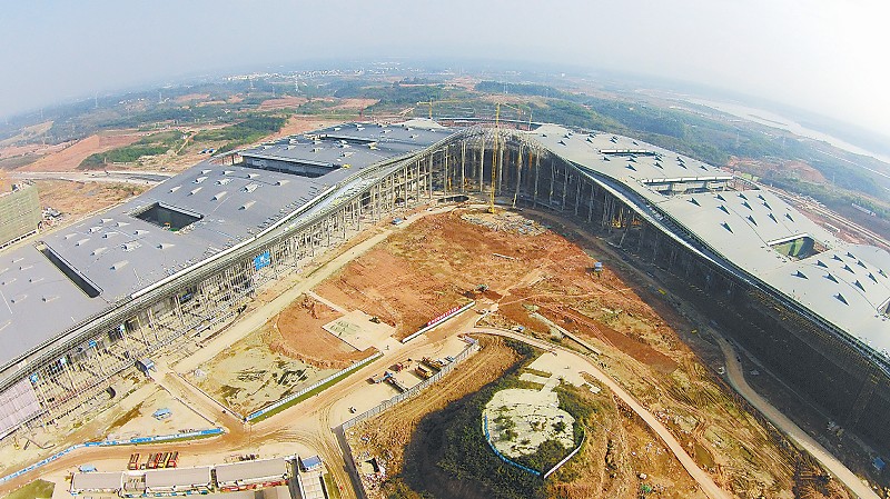 沿着成都天府大道南延线一直走,到达兴隆湖立交桥施工处,便看见矗立在一旁的巨大的中国西部国际展览展示中心标识牌。国内规模最大的展会项目之一——中国西部国际博览城已在这里火热建设了近一年半。记者看到,博览城一期项目——国际展览展示中心已经雏形初现。“一期项目占地57万平方米,目前主体工程已经完工,进入了装饰装修阶段。”项目总工程师余德浩介绍,工期只有两年,明年7月30日前必须完工。最忙碌的时候,现场有塔吊、吊车等机器200多台,有5000余名工人同时作业。