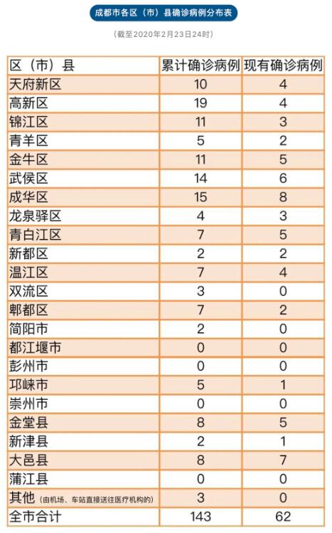 截至2月23日24时,成都市累计报告确诊病例143例,累计出院78人,死亡3人,其余62人(其中危重11人)均在定点医院隔离治疗,244名密切接触者正在接受医学观察。
