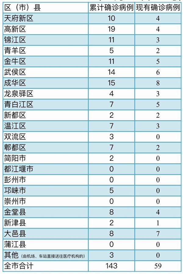 截至2月25日24时,成都市累计报告确诊病例143例,累计出院81人,死亡3人,其余59人(其中危重11人)均在定点医院隔离治疗,143名密切接触者正在接受医学观察。
