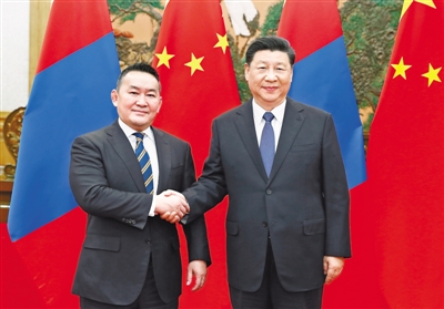 习近平指出,中蒙是山水相连的友好邻邦。中方高度重视发展中蒙关系,始终将蒙古国作为中国周边外交的重要方向。中方愿同蒙方一道,巩固政治互信,加强共建“一带一路”合作,共同推动构建命运共同体,更好造福两国人民,为地区和平稳定发展作出贡献。