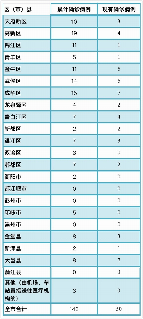 截至3月1日24时,成都市累计报告确诊病例143例,累计出院90人,死亡3人,其余50人(其中危重2人)均在定点医院隔离治疗,63名密切接触者正在接受医学观察。