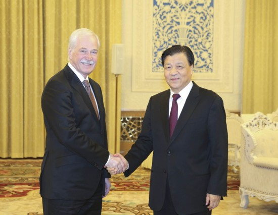 12月1日,中俄执政党对话机制第五次会议在北京举行。会议开始前,中共中央政治局常委、中央书记处书记刘云山会见参会的统一俄罗斯党代表团。这是刘云山与统一俄罗斯党最高委员会主席格雷兹洛夫握手。新华社记者 丁林 摄