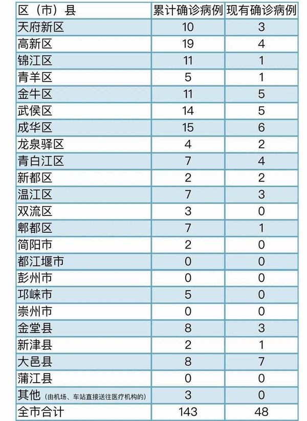 截至3月2日24时,成都市累计报告确诊病例143例,累计出院92人,死亡3人,其余48人(其中危重2人)均在定点医院隔离治疗,39名密切接触者正在接受医学观察。