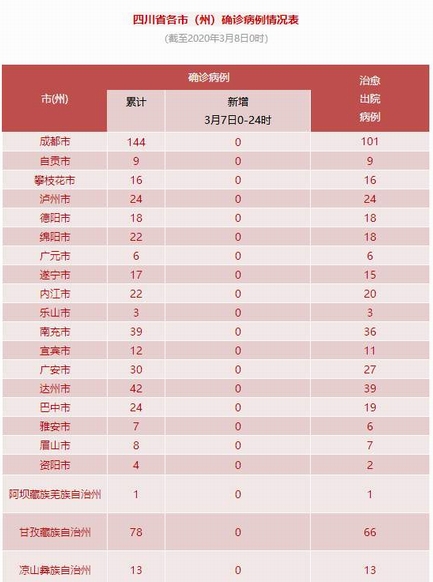 8日,四川新闻网记者从四川省卫健委获悉,3月7日0-24时,我省新型冠状病毒肺炎无新增确诊病例,新增治愈出院病例9例,新增疑似病例1例,无新增死亡病例。(确诊患者信息详见各市<州>卫生健康委官微或官网每日发布)