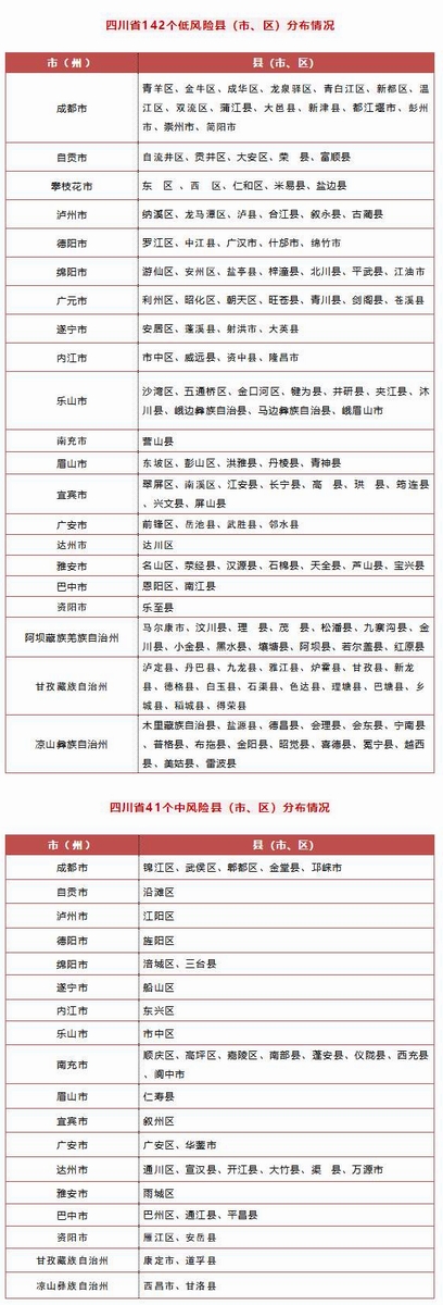 全省现有无现症病例区(低风险县<市、区>)142个、散发病例区(中风险县<市、区>)41个,无社区暴发和局部流行区(高风险县<市、区>)(过去24小时新增攀枝花市东区、剑阁县、营山县为低风险县<市、区>)。