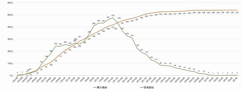 539名确诊患者中,正在住院隔离治疗79人,已治愈出院457人,死亡3人。