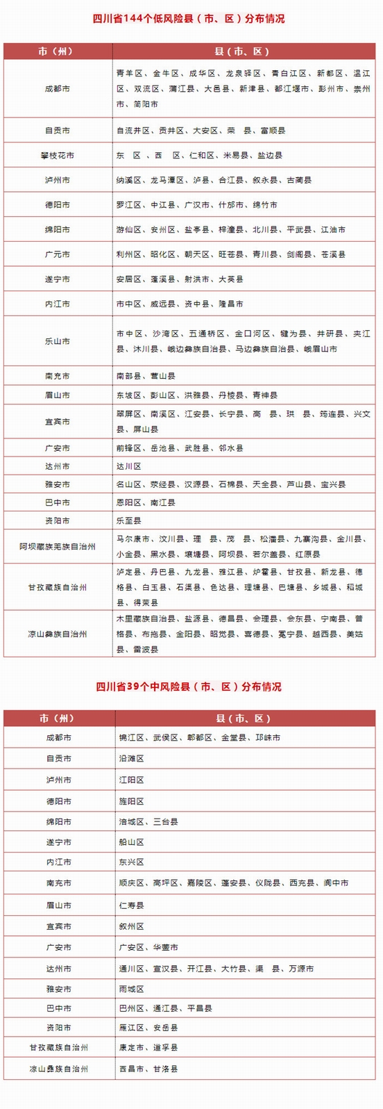 全省现有无现症病例区(低风险县<市、区>)144个、散发病例区(中风险县<市、区>)39个,无社区暴发和局部流行区(高风险县<市、区>)(过去24小时新增乐山市中区为低风险县<市、区>)。