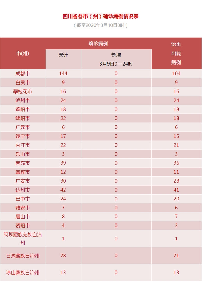 四川新闻网成都3月10日讯(记者 李丹)10日,四川新闻网记者从四川省卫健委获悉,3月9日0-24时,我省新型冠状病毒肺炎无新增确诊病例,新增治愈出院病例5例,无新增疑似病例,无新增死亡病例。