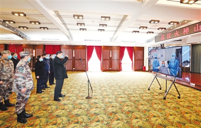 习近平通过远程会诊平台,同正在病区工作的医务人员代表视频连线,询问工作和保障情况。习近平强调,一线的医务工作者最辛苦,承受着难以想象的身体和心理压力,许多同志脸上和手上被磨出了血,令人感动,是新时代最可爱的人。我向你们表示崇高的敬意!习近平叮嘱广大医务人员加强自我防护、抓住机会休息,既敢于斗争、又善于斗争。有关部门要落实好防护物资、生活物资保障,落实好工资待遇、临时性工资补助、卫生防疫津贴待遇,尽快出台关心关爱一线医务人员的政策措施,帮助大家解除后顾之忧,确保大家以饱满的精神状态投入到工作中。