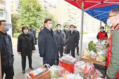 在社区生活物资集中配送点,习近平详细询问米面粮油和新鲜蔬菜水果等生活物资的采购和供应情况,强调要千方百计保障好群众基本生活。在察看社区警务室、卫生服务站、物业中心等运行情况后,习近平来到社区党群服务中心,了解社区实行网格化管理、联防联控、群防群治工作情况,对他们的工作表示肯定。