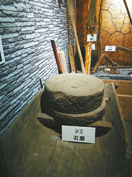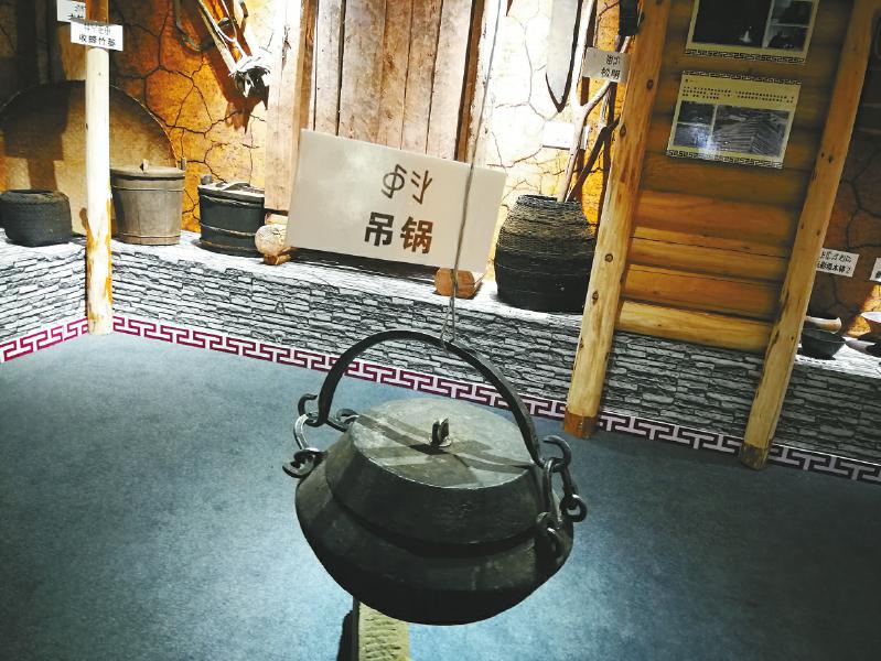 三河村村史馆内陈列的吊锅、石磨和彝族漆器等生活用具。