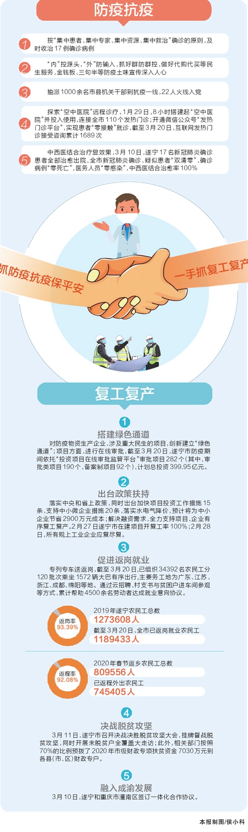 3月10日,随着两名新冠肺炎确诊患者治愈出院,遂宁市确诊病例“清零”,这是遂宁市抓防控保民生科学施治取得的阶段性成果。与防疫同步,春耕复工不停,脱贫攻坚不松,发展机遇不错过。