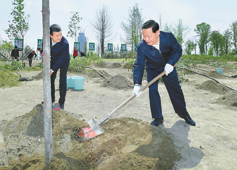 四月八日,省委书记彭清华到成都市调研公园城市建设推进情况。在天府中央公园,彭清华与天府新区干部群众一起植树造林,为公园城市建设再添一抹绿、贡献一份力。本报记者欧阳杰摄