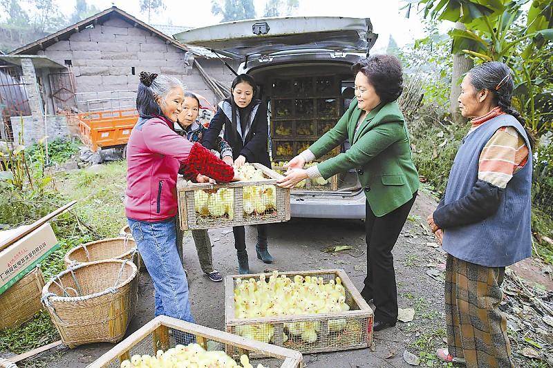 11月13日,内江市东兴区总工会的党员干部在顺河镇冷家村向贫困户发放“扶贫鹅”。本报特约通讯员 兰自涛 摄